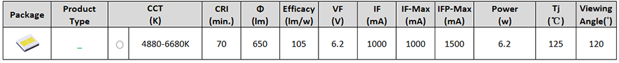 產(chǎn)品特點(diǎn): •使用高導(dǎo)熱陶瓷基板 •高流明輸出及高光效 •低熱阻 •耐高電流驅(qū)動(dòng) •符合AEC-Q101可靠性測試