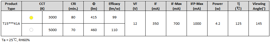 產(chǎn)品特點(diǎn): • 使用高導(dǎo)熱陶瓷基板 • 高流明輸出及高光效 • 高顯色性 • 色容差SDCM<3 • 低熱阻 • 耐高電流驅(qū)動(dòng)